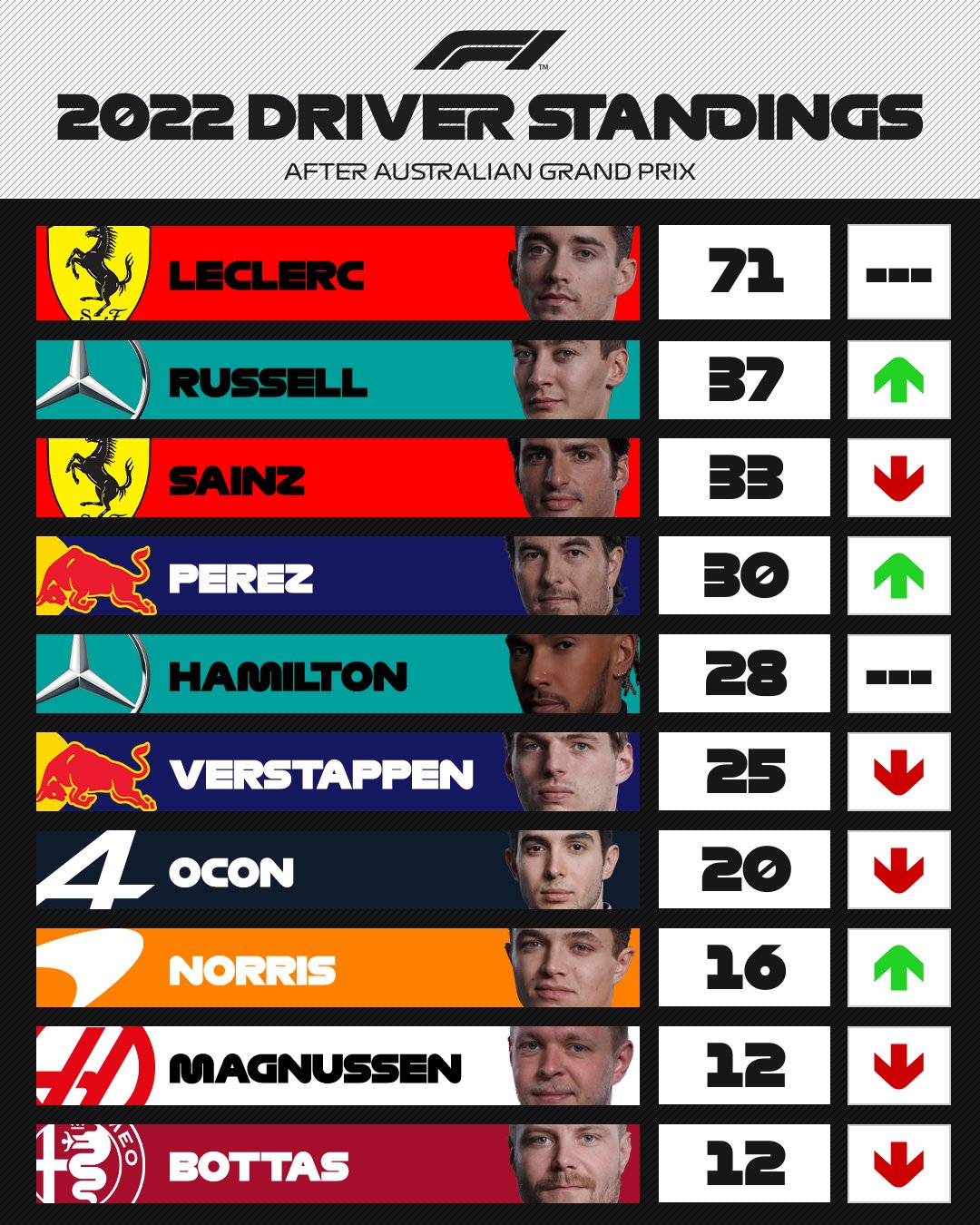 Formula 1 On Twitter Driver Standings Charles Leclerc Increases His Championship Lead To A Larger Margin Than Anyone Did In 2021 And Georgerussell63 Makes A Move Into P2 Ausgp F1